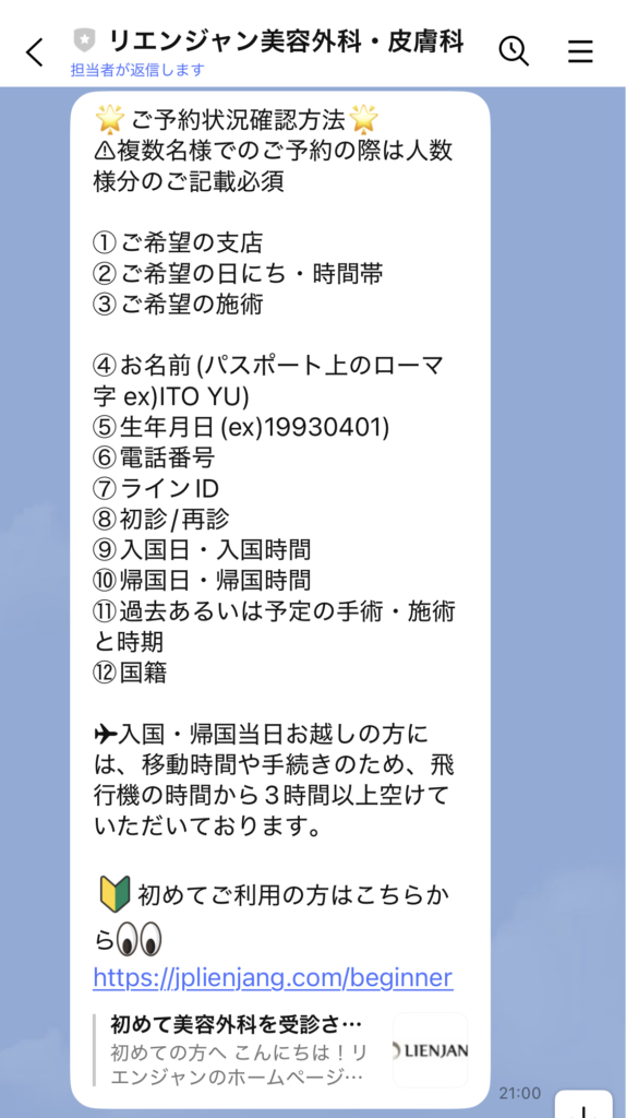 公式HPやインスタなどからLINE登録すると、日本語でこういう案内が届きます。