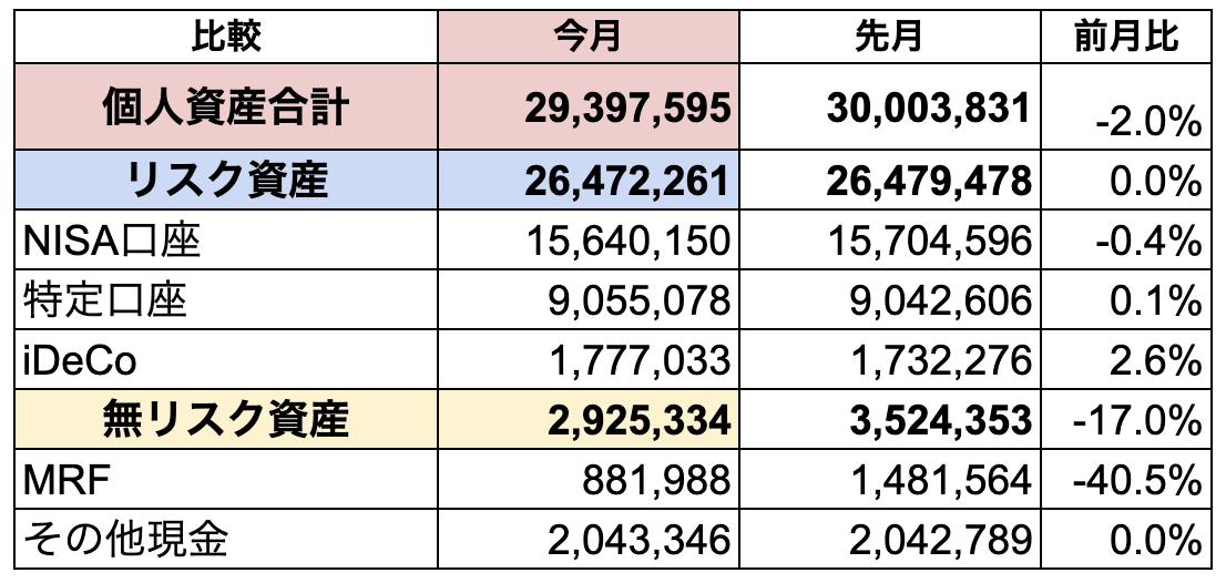 リスク資産は、前年比+107万円、先月と変わらずでした。